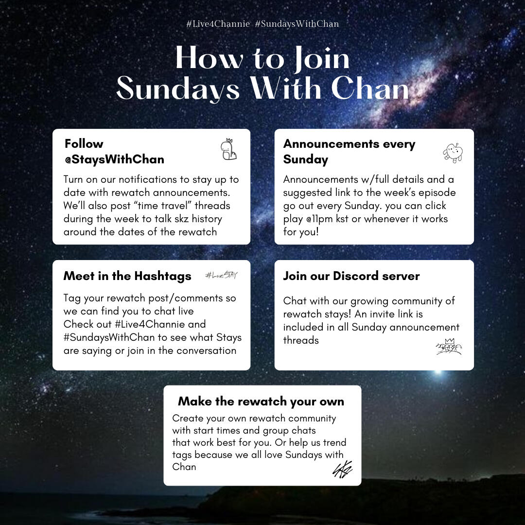 Join us here: https://t.co/KKdjUisx1YJust like SKZ we don't believe in formalities. Sundays with Chan are on a come and go basis. Join when you can, and don't worry if you miss us. This account will live tweet the week's episode, but we also post a re-cap for stays who couldn't make it. No stay is left behind in the rewatch community